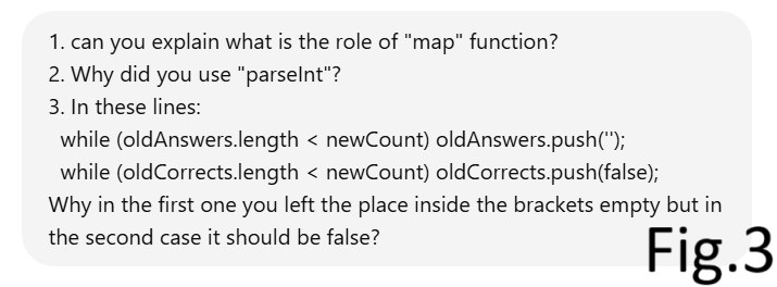 What did I learn: Everything mentioned above was something I learned during this project by the help of AI and tutorials and I find it really useful for the future. I mean all the advanced JavaScript but HTML and CSS I knew how to do just by myself. For some functionalities I had no idea how to implement like saving the data inside an array for example so whenever the user clicks somewhere else and then comes back to the question he typed in already so his input is shown on the screen, so in situation like this when I had no idea how to do it I asked chat gbt to help me do it and then I was trying to understand how and why it works. As I already explained above how each functionality works, and in case I didn’t understand something in the code I copy pasted the line of code and told AI to explain in details (check fig.2 and fig.3 as an example).