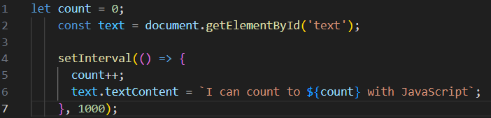 Here is the first challenge! I made number 0 to count upwards every second infinite times unless you restart the page. Firstly, I made the count to start from 0 and inside that function I defined the Text constant by getting element by id. After that I set an interval so it counts upwards by 1 number every second.