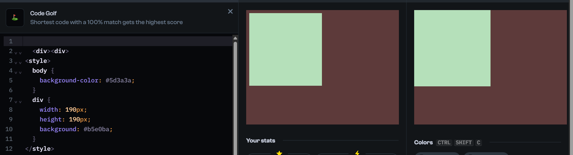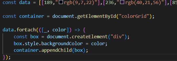 Firstly in HTML I created a div with id=colorGrid which I will need in JavaScript. After that I created a grid layout with 16 columns in CSS. After that in JavaScript I added the array which was given in the challenge and then defined the container constant by id. Then, using a forEach function - iterates over the array and adds div elements to the grid with the background color from the arrayitem. You can check on the left side how it looks and the JavaScript code also.