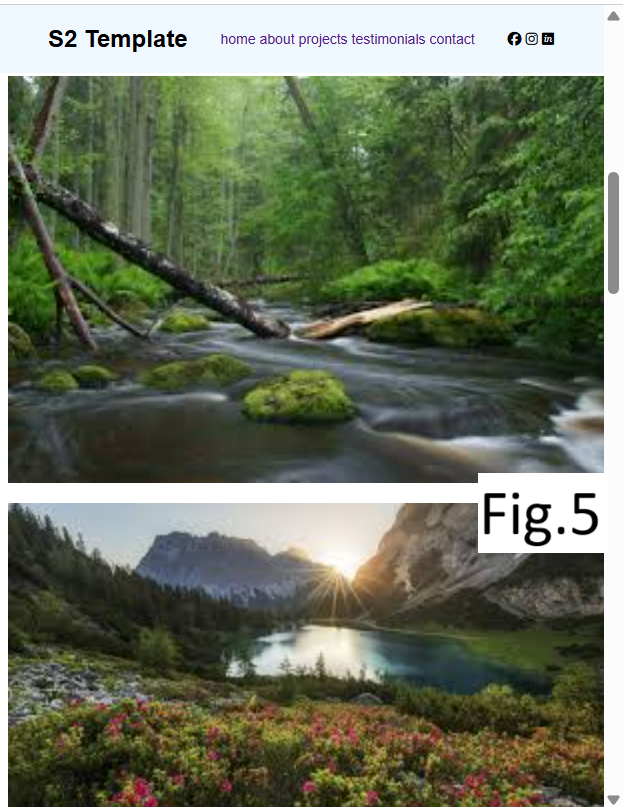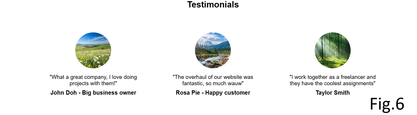 What did I do: I used just HTML and CSS to make a fully responsive page indicated in the challenge. Making it responsive was optional but I did it using media queries, flex box and grid. I put a max width of 767 px for phones and over 768 px for tablets and desktop. (Click here to see the code) I did so because Maikel advised us to use specifically this size of screen for media queries in one of the bootcamps. You can check fig.1 and fig.2 how my page looks both on phones and desktop. Another requirement for the challenge was to use correct semantic elements. For the header I used nav tag with ul tag inside and li tag with links inside and I used icons from “font awesome” website. I used section tag with h1, img, and p tags inside and in the end I made a footer. Click here to view the HTML file. For the pictures I chose a grid layout (Click here to see the code) so they are responsive on all screens. (check fig.3, fig.4 and fig.5) For testimonials I used flex box and grid (Click here to see the code) and check fig.6 to see how they look. And also I made a fixed header which was optional.