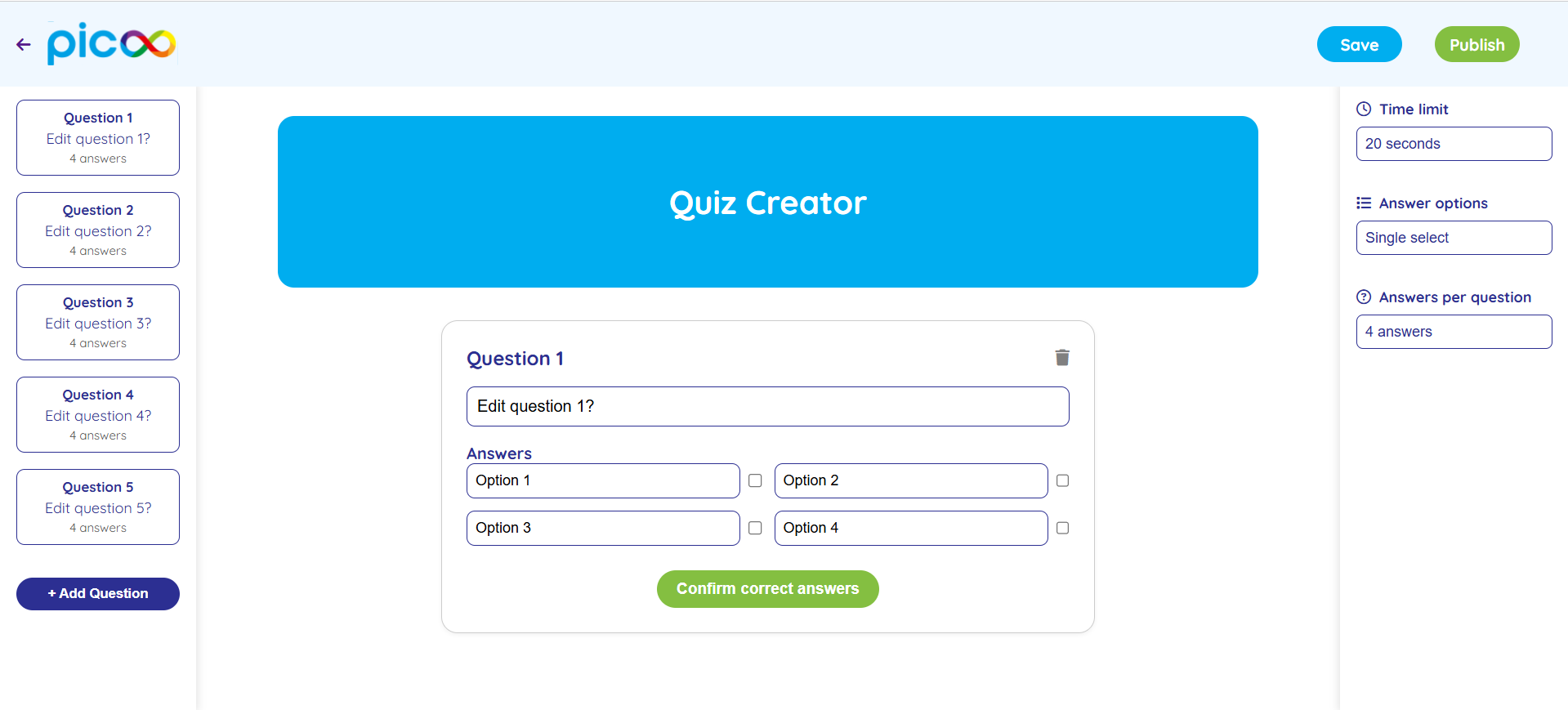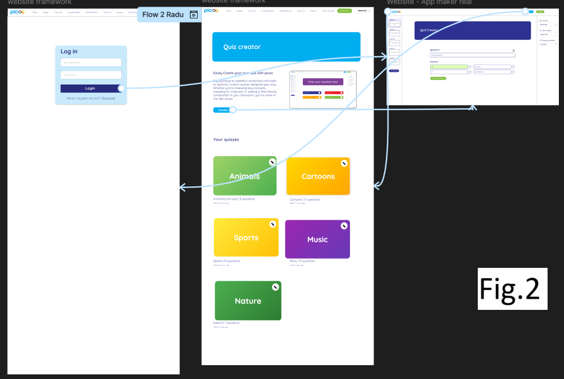 What did I do: I made an interactive prototype for picoo project so the user can create his own quiz (check fig.2 or use the link above to go to figma) . My prototype consists of one Home page where I’m trying to explain the reasons why he might need to create his own quiz and I also put an image of how the “create quiz” page is going to look like so the user has a complete overview of what to expect. And also I did a “Create” blue big button to grab user’s attention by clicking on which he will be redirected to the “Create Quiz” page. If you scroll a little down you will see your existing quizizz. In the “Create Quiz” page I included 2 aside bars: on the left one you see how many questions you have and in case you need more you are supposed to click on “Add question” button. In the center is the question editor itself where user is supposed to compose the question and the answers and clicking the checkbox for choosing the correct answer. In the right aside bar the user can choose the time limit for each question, if he wants to have single or multi correct answers per question and also choosing the number of options for each question. After that if the users decides to save his quiz he just created he will need to log in or create an account. This was made to increase the chances for user to create an account (if he doesn’t have one) after the user spends his time creating his quiz the chances are low for him to give up and not save his work which increases the chances for the user to come back to picoo website and become a client.