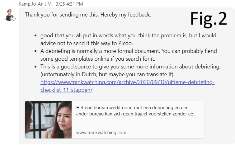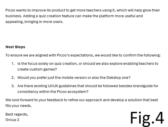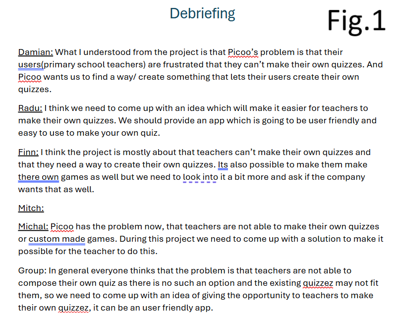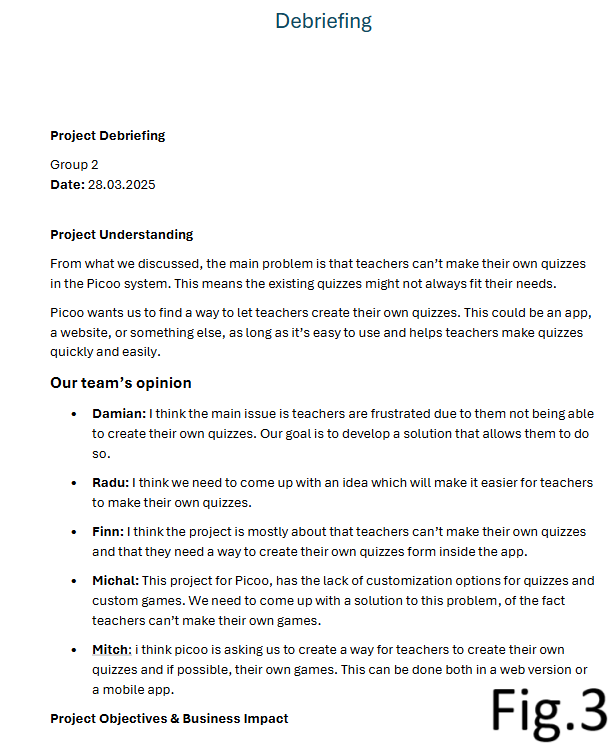What did I do: In the beginning of UI/UX picoo project we as a group were advised to write a debriefing for picoo company to set the goals clearly for everyone. We decided so everyone writes 1-2 sentences about how they understood the problem and what the solution we can come up with (check fig.1 to see the initial debriefing). But before sending it directly to picoo I decided to show it to Jo-An (UI/UX professional) and get feedback from her (check fig.2 to see her feedback). Her feedback to us was to improve our debriefing by doing it in a more formal way but not as we did it. For this she provided us a source from where we can see examples of good debriefing, how to write a good debriefing and some good templates. Taking all of this into consideration I made some changes to the debriefing document (check fig.3 and fig.4) and made it more formal following a template: added a header indicating group number, the date. After that I added a small introduction with a title “Project Understanding” and in the end I added the “Next steps” section including some follow up questions for picoo to answer.