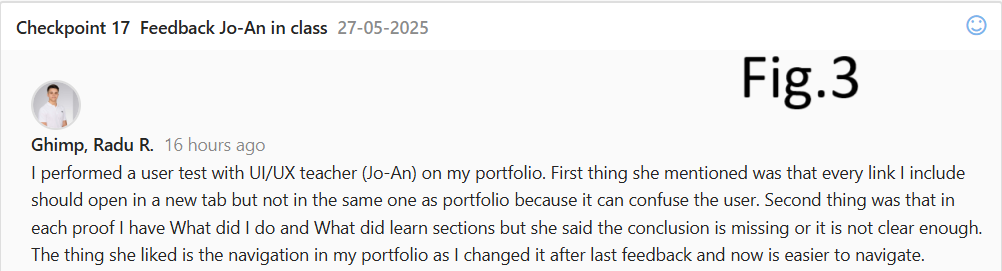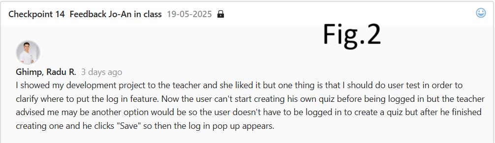 How did it go: Everything went as I expected, even a little better because the user was able to share his opinion on the log in pop up, how it suits him the best. And actually, the whole idea with log in pop up is based on Jo-An feedback (check fig.2) where she advised me to think more about the location of the log in pop up and to do a user testing and see what the user thinks, which is exactly what I did as I explained above.