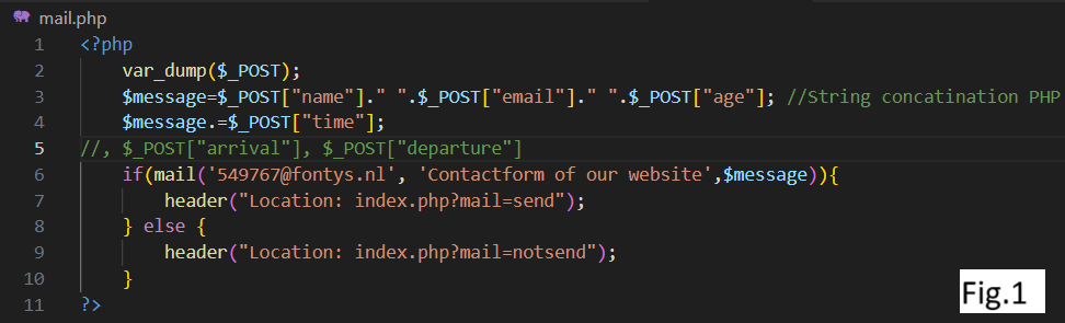 What did I do: I managed to do the PHP challenge from Maikel’s bootcamp after having an introduction to PHP in general. Honestly, before the bootcamp I didn’t even hear about PHP and had no idea what is this. Now I know how to send an automatic email (see fig.1) and know how string concatenation works in PHP after Maikel explained me. He adviced me a really helpful website about PHP where I checked how tags should be written with “$” sign and in which order, so in this way I can get whichever input from the user I want to my email, for example name, surname, arrival, departure and other inputs.