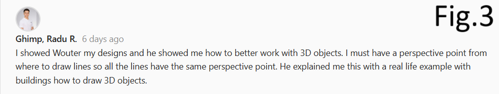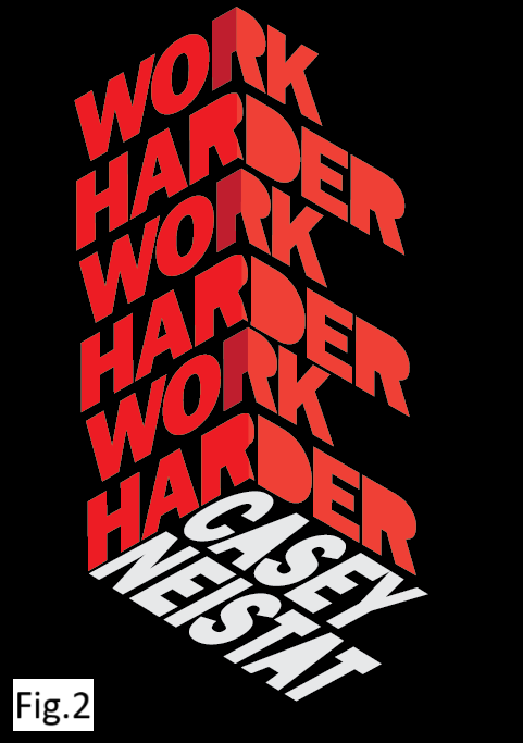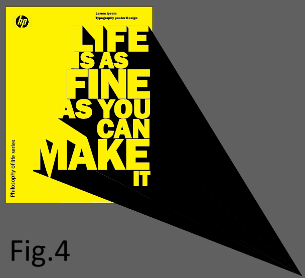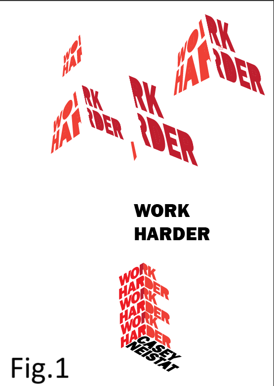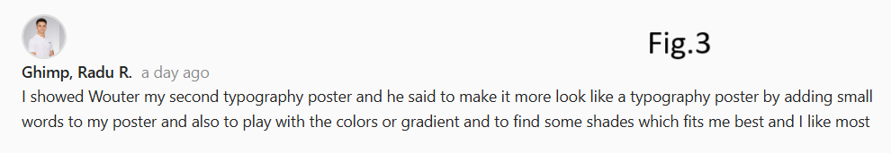 What did I do: Firstly I started with doing something weird and learning adobe tools (check fig.1) After I struggled with placement of each letter and making shadows I came up with this (check fig.2) After that I showed it to Wouter and he said that each shadow must have the same angle and then he explained with real life examples why should it be like that and how to do it (check fig.3 for feedback) then he showed me how to put a perspective point to where all shadows must go to (check fig.4 and see how each shadow goes to one exact point called perspective point) This small change made my poster look more professional rather than having all those shadows with random angles.