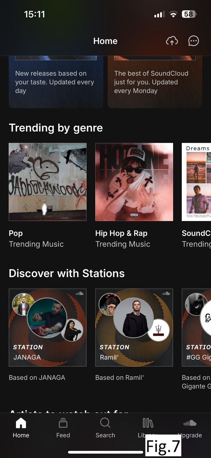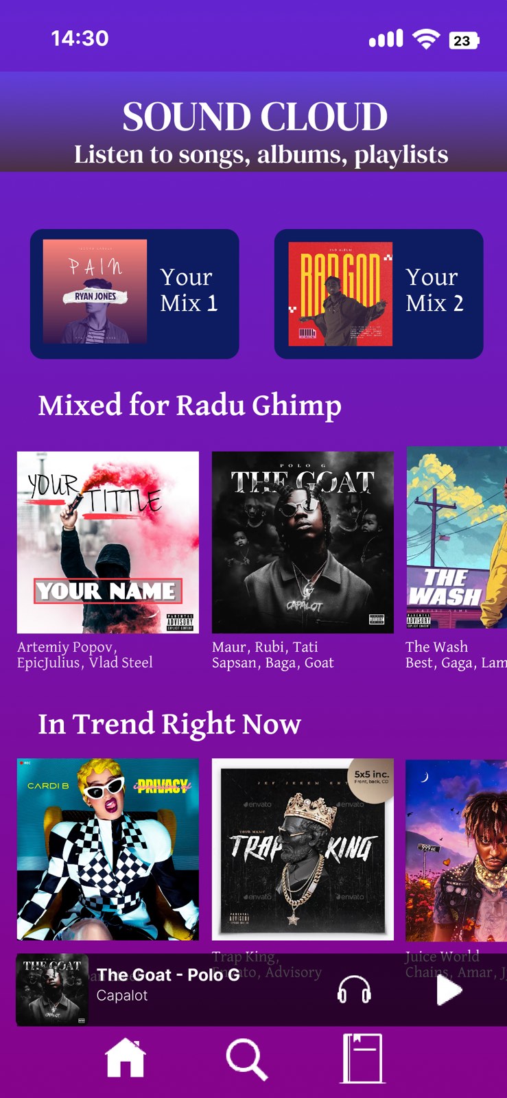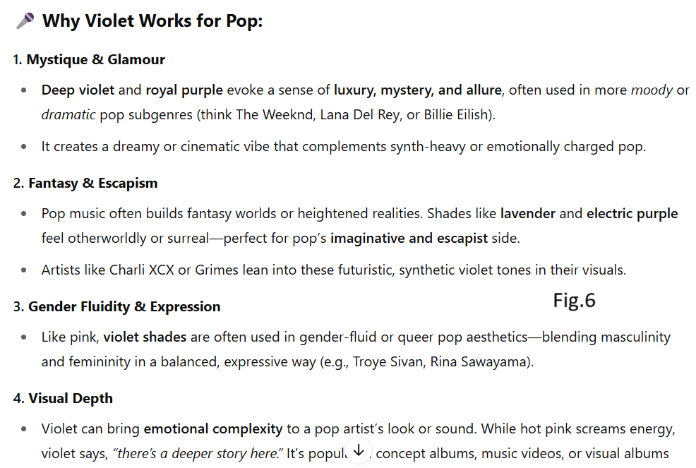 What did I do: I wanted to recrate the app of Sound Cloud in the way I like. First of all I tried to combine the classical music style with pop music (see fig.1 and fig.2). You can see the font and colors I chose are more for classical music but the songs itself are pop style. Wouter said that it is very good that I try to experiment and create my own style but in this situation it is better to follow one style and I chose to do it for pop music. Based on my research I chose the main color to be different shades of violet with blue and I made a gradient out of it because this color gives the vibe of pop music. I searched online for “pop music vibes” and noticed that the most abundant color which caught my eyes attention immediately was different shades of purple. (check fig.5 for some examples I saw) Also I asked Chat GBT for confirmation (check fig.6) and after that I searched some albums of Billie eilish, The weekend and Lana del Ray to check if information from ChatGbt is indeed true so they also use different shades of purple (check fig.8, fig.9 and fig.10) which is going to give a pop music vibe. Besides that, Wouter showed me the difference between a professional app music and mine how all small details make such a huge difference. So he suggested me to look for tiny details and implement them as margins of playlists and having one playlist showed on half on the right side so the user understands that he needs to scroll horizontally to see more playlists available. So that what I did I looked for a lot of small details in actual Sound Cloud app (check fig.7) and recreated them also the music bar which shows the current song playing on the first page which I omitted in the first prototype.