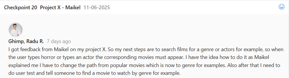 What did I do: Firstly, I followed a tutorial on how to create a movie website in react and came up with this version (check fig.1). I showed it to Maikel and we discusssed what else I can change or add and he said to make it possible for the user to search for movies by genre not just by name in case the user doesn’t know the name and doesn’t know which movie to watch. (check fig.2 to see Maikel’s feedback) I did it by adding one more route in api.js file to go to “/genre/movie/list” the same thing I did to search the movie by name but in that case I used the path to get the popular movies: “/movie/popular” (If needed click here to see the full code in api.js file) So in the end, after I made it possible for the user to search by both name and genre of the movie my website looks like this (check fig.3). If you want to actually see how to search a movie by name or by genre click here to see the gif