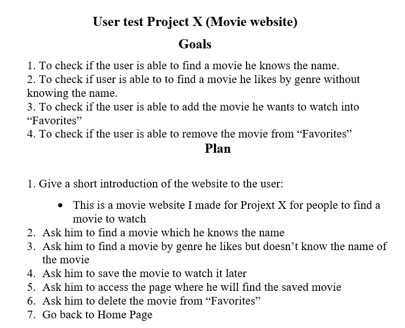 What did I do: I asked my roomate who often watches movies to perform an user test on my movie website where I asked him to do several things based on my User Plan I did before. (check fig.1 to see the plan) I included the goals I want to achieve by doing that user testing and a step by step guide to follow during user testing.