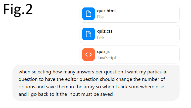 What did I learn: Everything mentioned above was something I learned during this project by the help of AI and tutorials and I find it really useful for the future. I mean all the advanced JavaScript but HTML and CSS I knew how to do just by myself. For some functionalities I had no idea how to implement like saving the data inside an array for example so whenever the user clicks somewhere else and then comes back to the question he typed in already so his input is shown on the screen, so in situation like this when I had no idea how to do it I asked chat gbt to help me do it and then I was trying to understand how and why it works. As I already explained above how each functionality works, and in case I didn’t understand something in the code I copy pasted the line of code and told AI to explain in details (check fig.2 and fig.3 as an example).