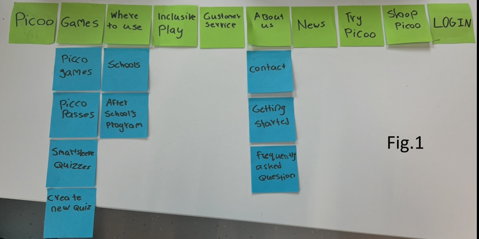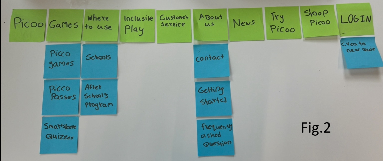 What did I do: I asked 10 people to take part in card sorting, few of them were some random Fontys students and 3 were my roomates. I explained everything they needed to know about picoo website and gave them bunch of subtitles (blue stickers) and asked them to match them with titles (green stickers) After the card sorting I noticed that 7 people put the “Create quiz” subtitle under “Games” title (check fig.1) and 3 people put it under “Log in” title (check fig.2) and said that you must be logged in to create a new quiz.