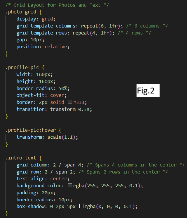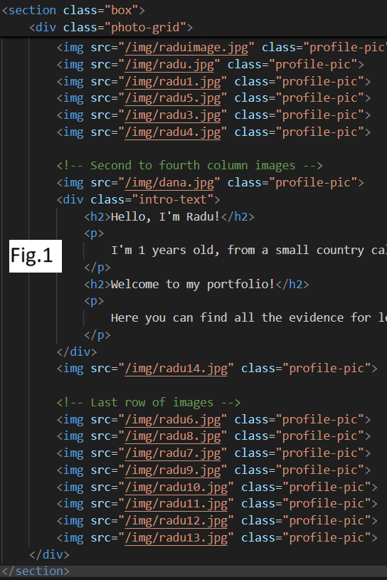What did I do: I implemented my portfolio for 2nd semester in HTML and CSS which shows my coding skills, not on a very high level I agree but still it shows that at least I know the basics. For example I used the grid in the home page to organize my personal photos in a rectangle with text inside. (see fig.1 and fig.2 both HTML and CSS) I used flex box for organizing the content and pictures the way I want for absolutely every proof in my portfolio, to see an example how it looks like check fig.3 and fig.4 for both HTML and CSS). Also, because of flex box and grid and I used max and min width and height instead of just width and height my website is responsive, not fully responsive because we still need to have some workshops with Maikel about this so in the end I will try to make it fully responsive.