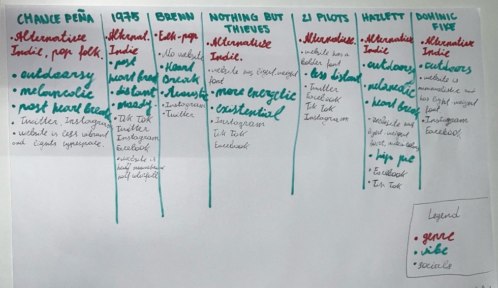 What did I do: I wrote everything down while also helping Julien with research, as we needed to gather a lot of information and analyze multiple artist websites. We selected seven artists from Owen’s playlist—ones he listens to often—and compared them based on genre, vibe, and social media presence. After extensive research, we found many similarities among them. The dominant genre was Alternative Indie, with a post-heartbreak and outdoorsy vibe. Regarding social media, Owen should definitely have an Instagram, as all seven artists do, and a TikTok, since six out of seven use it. From analyzing their websites, we noticed a preference for lightweight fonts, minimalistic design, with pictures of themselves on the website which is a part of the design.. I’ll keep this in mind when designing Owen’s website. (A part of this text was shortened by AI as my initial text was too long.)