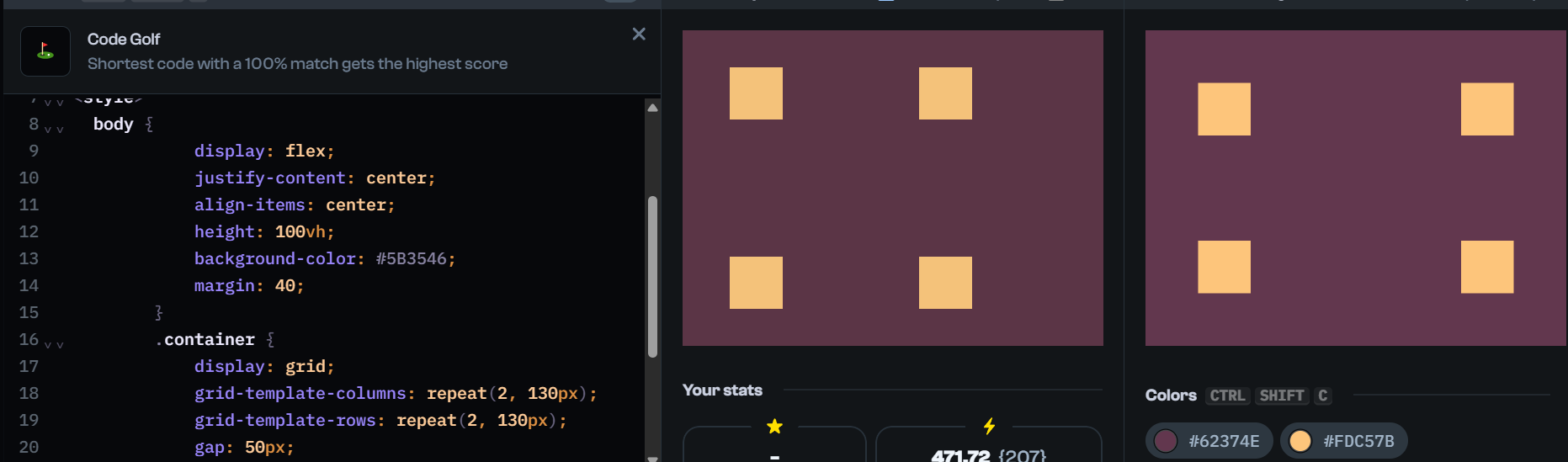 Firstly in HTML I created a div with id=colorGrid which I will need in JavaScript. After that I created a grid layout with 16 columns in CSS. After that in JavaScript I added the array which was given in the challenge and then defined the container constant by id. Then, using a forEach function - iterates over the array and adds div elements to the grid with the background color from the arrayitem. You can check on the left side how it looks and the JavaScript code also.
