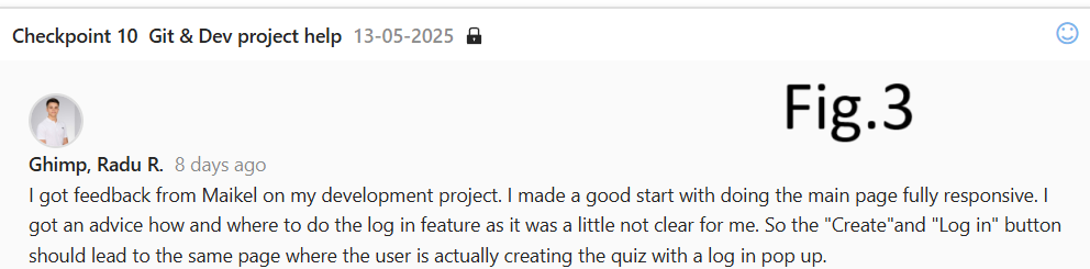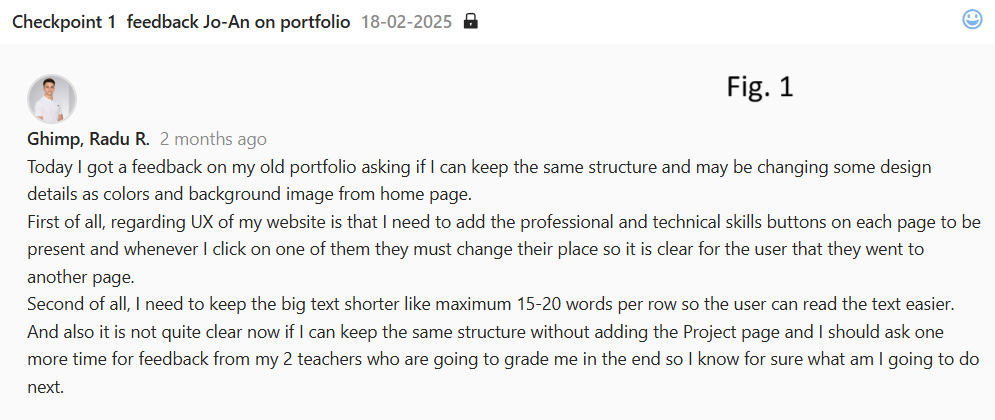 How did it go: Everything went as I expected, even a little better because the user was able to share his opinion on the log in pop up, how it suits him the best. And actually, the whole idea with log in pop up is based on Jo-An feedback (check fig.2) where she advised me to think more about the location of the log in pop up and to do a user testing and see what the user thinks, which is exactly what I did as I explained above.