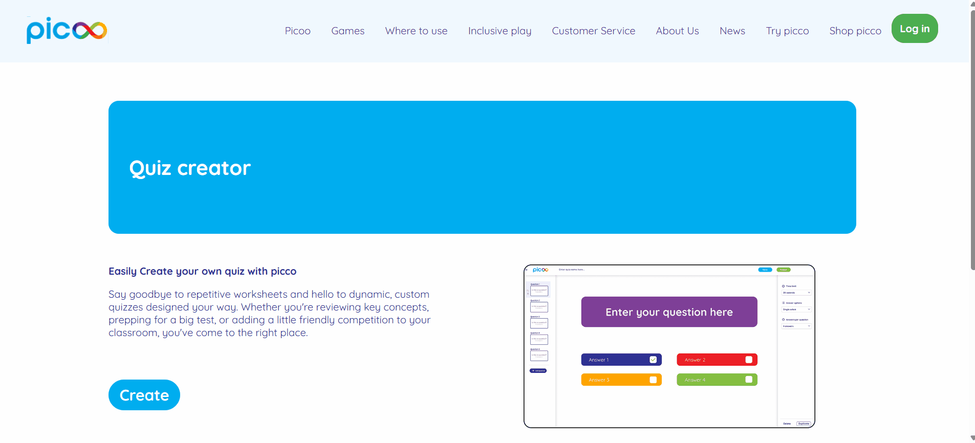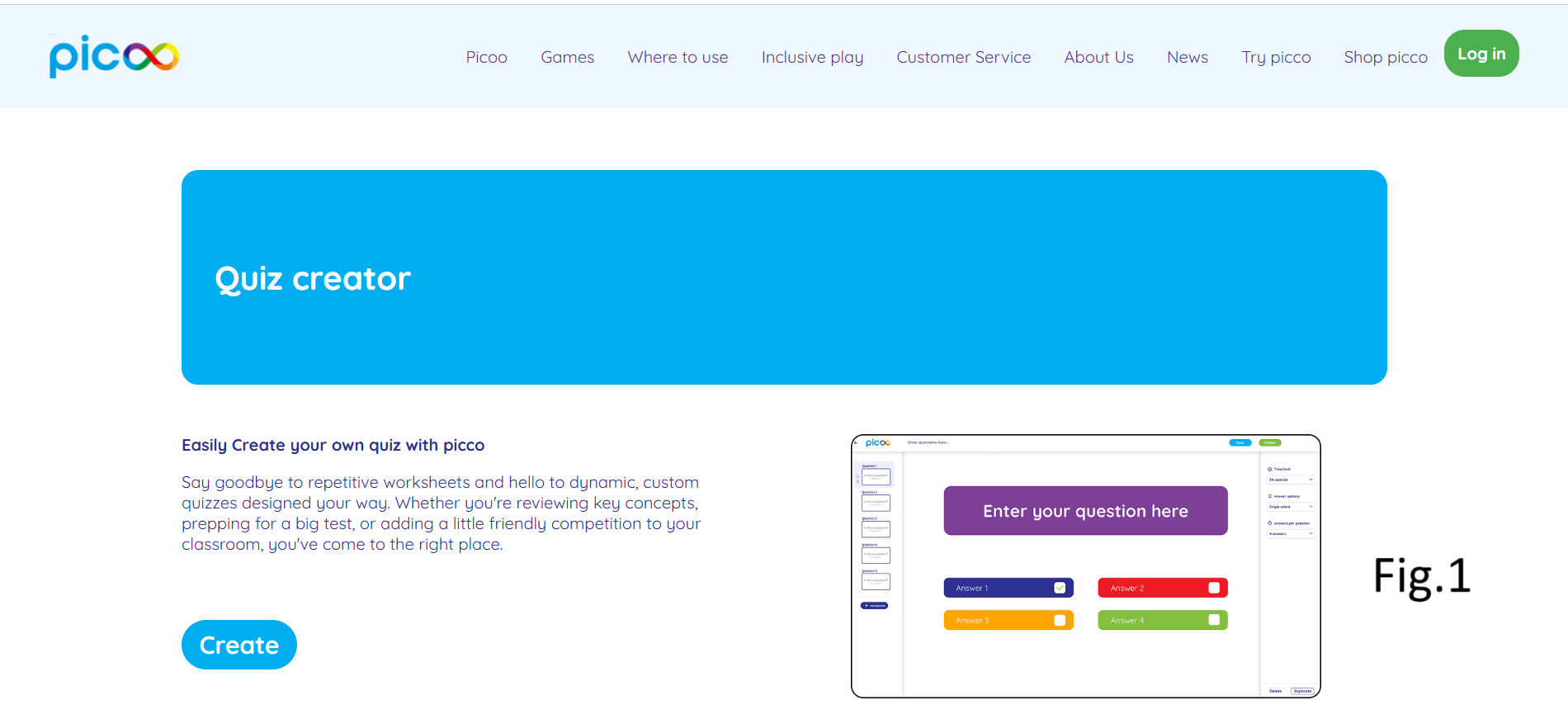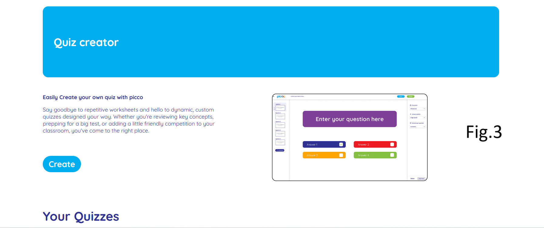 What did I do: I made an interactive prototype for picoo project so the user can create his own quiz (check fig.2 or use the link above to go to figma) . My prototype consists of one Home page where I’m trying to explain the reasons why he might need to create his own quiz and I also put an image of how the “create quiz” page is going to look like so the user has a complete overview of what to expect. And also I did a “Create” blue big button to grab user’s attention by clicking on which he will be redirected to the “Create Quiz” page. If you scroll a little down you will see your existing quizizz. In the “Create Quiz” page I included 2 aside bars: on the left one you see how many questions you have and in case you need more you are supposed to click on “Add question” button. In the center is the question editor itself where user is supposed to compose the question and the answers and clicking the checkbox for choosing the correct answer. In the right aside bar the user can choose the time limit for each question, if he wants to have single or multi correct answers per question and also choosing the number of options for each question. After that if the users decides to save his quiz he just created he will need to log in or create an account. This was made to increase the chances for user to create an account (if he doesn’t have one) after the user spends his time creating his quiz the chances are low for him to give up and not save his work which increases the chances for the user to come back to picoo website and become a client.
