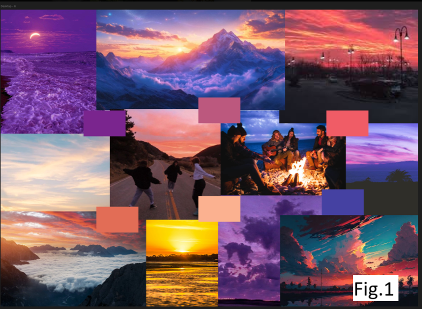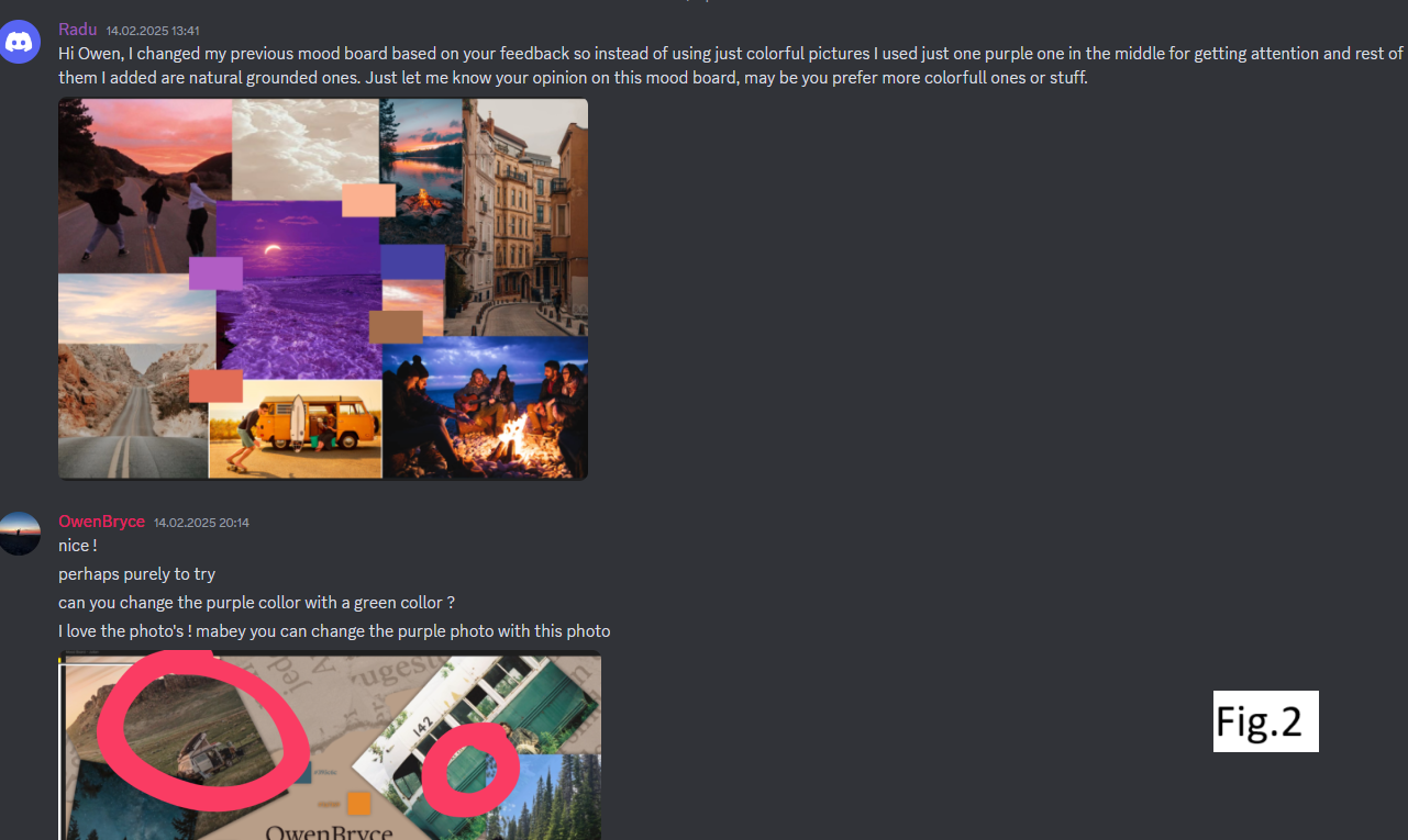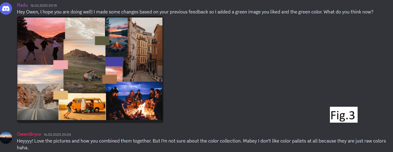 What did I do: I made the first version of Mood Board(see fig.1) based on Owen’s presentation where I tried to get his mood, favourite colors and feelings so I can put it all together in a mood board. After I showed him he said I chose too many colorfull pictures and should have used more grounded colors. So I made the second version of mood board(see fig.2) where I decided to use just one colorfull purple picture and to put it in the center and rest of them are grounded and natural colors. After Owen checked one more time he said that purple doesn’t really fit well there and that I should find a great green picture(you can see his comments also in fig.2 down part) So I started to iterate again and put a green image in the center and also changed some of other images(see fig.3) And finally he liked all the images and how I organized them but there was still a thing with color palette, he said I used too raw colors.(you can see his comments also in fig. 3 down part) By that time Kate worked on a color palette which Owen liked it so I took 5 colors from her but I still needed to find one more which I had to search for. After analysing all possible colors for the color palette me with Owen concluded that this is the final version of our Mood Board(see fig.4)