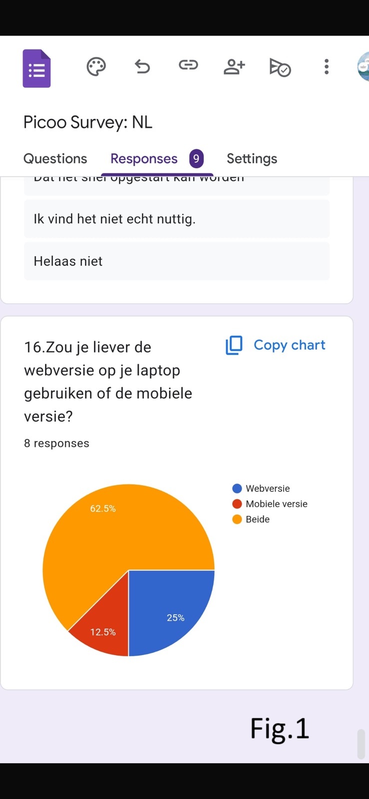 Introduction: Picoo UI/UX prototype project semester 2. If you want to open it in figma Click here. (my prototype is in the top right corner called Flow 2 Radu) So we as a group decided that we need both desktop and mobile versions for users to be able to create a quiz. This decision was made based on our survey which was posted by picoo company on their socials online and the majority of people (62.5%) said that they prefer both versions (check fig.1). So after that we split the work among the group members and as more of them wanted to do the mobile version I chose to do the Dekstop one.