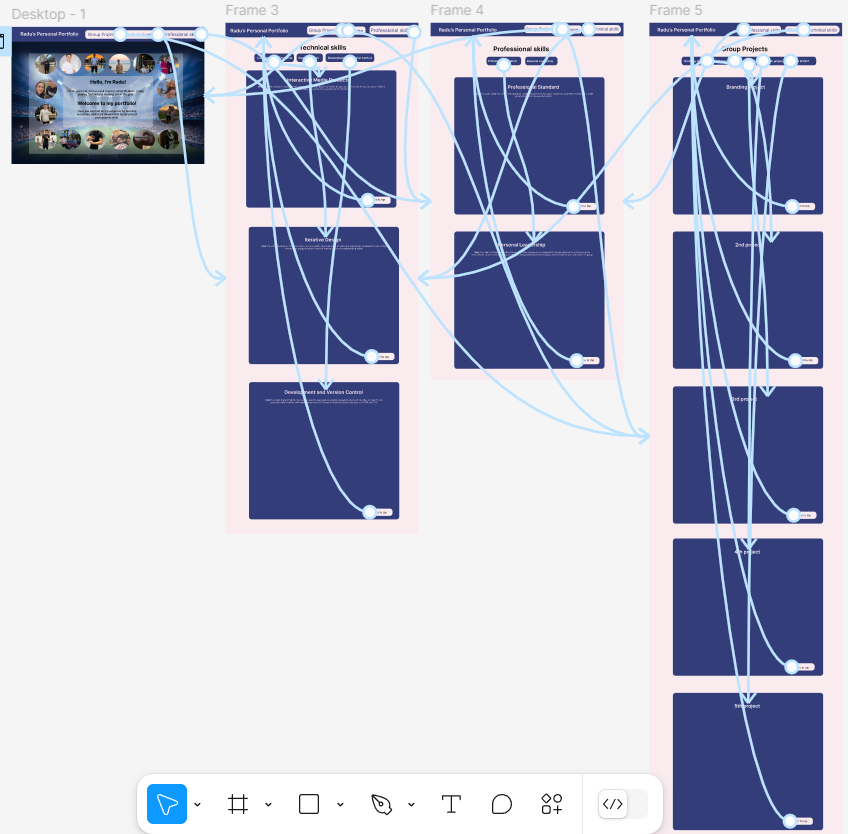 What did I do: I made an interactive prototype for my portfolio so I have an idea how it is going to look like, especially the design on “professional, technical skills and group project” pages. I spent a lot of time looking for the perfect pair of colors so the content can be easily readable for teachers and so it also to look good. As for example, there will be a lot of information displayed on the screen so I searched for a pair of colors which is not going to make teacher’s eyes easily tired. Also I spent some time organizing the photos on the “home page”, as each of the photos has a specific place and size in the layout I chose for the “home page” forming a rectangle from all personal pictures I chose. In terms of content I also thought in a way so the text is not too long in a row which will make it difficult to read, I thought to put photos on the left side and the text on the right side.