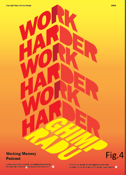 What did I do: Firstly I started learning how to use the necessary tools in order to fake a 3D object in adobe illustrator (check fig.1) After that I started on a new page actually creating that cube out of words and made it with a black background (check fig.2) After that I went to Wouter for feedback and he said that it doesn’t look like a poster and I need to add small words or sentences near my cube like “Copyright from Radu Ghimp” and stuff. Also, he advised me to play with the colors and change the black background and make it in my own way (if needed check fig.3 for his feedback) Based on his feedback I changed my poster and now it looks way more professional and more like a typogropghy poster. You can see in fig.4 how I added a small heading at the bottom and wrote small sentences and at the top added copyright and the year 2025.