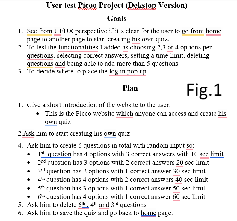 What did I do: I asked my roommate to perform a user test on the Picoo project I implemented myself. But before that, Maikel suggested me to do a plan of what I’m going to ask the user to do. And also in the beginning I should mention the goals I want to achieve by doing this user test. (check fig.1 to see my goals and plan) By doing this user test I wanted to know if it is clear enough for the user to go to “Create quiz” page and also I wanted to test all functionalities I did in order to create a quiz, such as: choosing 2,3 or 4 options per questions, selecting correct answers, setting a time limit, deleting questions and being able to add more than 5 questions. And one more thing I wanted to figure out is where is the best place for the log in pop up as I had 2 options to place it. So I explained to the user both options and tested it out and the user said that he would prefer to be able to create a quiz without being logged in and in case he will want to save the quiz then he will need to log in. When I showed him the second option he said that he might give up on creating a quiz if he needs to create an account first, which is true and I also agree with him as picoo company is going to loose potential clients this way.